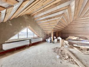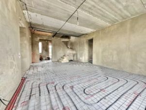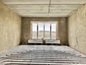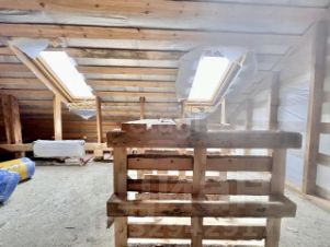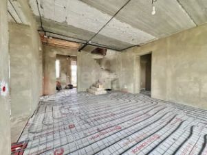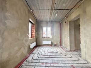 Коммуникации и состояние: ленточный фундамент, крыша из металлочерепицы, пластиковые окна VEKA. Стены отштукатурены, потолок утеплен, разведена электрика, установлена система теплого пола. Газ идет по границе участка под землей и заведен в дом (установлен двухконтурный котел Baxi и батареи), центральное водоснабжение и электричество; канализация — выгребная яма.